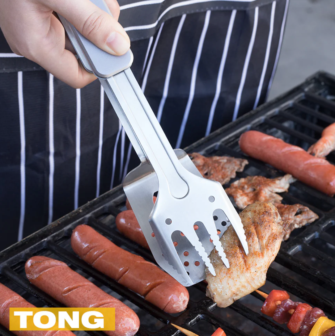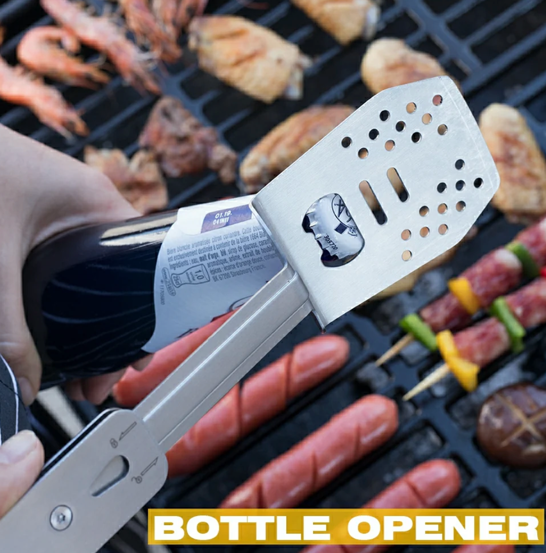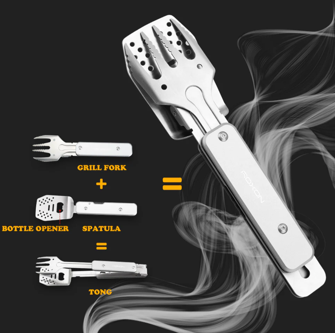 Juego de herramientas combinadas de mini barbacoa y barbacoa 4 en 1 con espátula, tenedor, pinzas y abrebotellas para acampar de senderismo (gris).